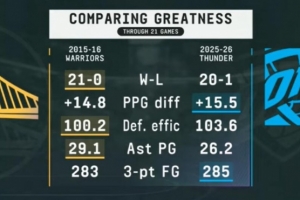 勇士场均净胜分高达+14.8分,雷霆达到了+15.5分