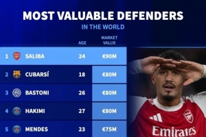 体育资讯12月15日讯 德国转会市场列出了后卫身价排名,萨利巴9000万欧居首。