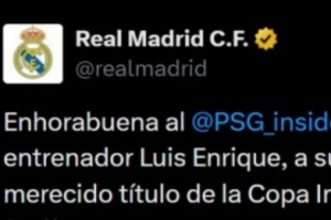 皇马官方社媒也送上祝贺:“祝贺巴黎圣日耳曼俱乐部、主席纳赛尔·阿尔赫莱菲、主帅路易斯·恩里克、球员以及所有球迷,你们完全配得上洲际杯冠军。”