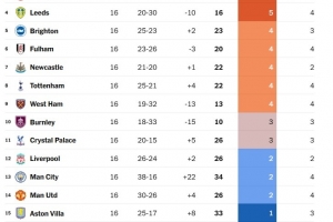 TA盘点了英超乌龙球另类积分榜,回顾了上赛季以来各队产生的乌龙球情况(包括对手打进的乌龙球)。因此,桑德兰、伯恩利和利兹联的数据来自上赛季的英冠联赛。
