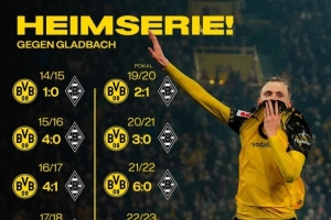 多特官方社媒晒出主场对阵门兴的战绩图片,庆祝球队取胜,近13次主场对阵门兴,多特全部取胜。