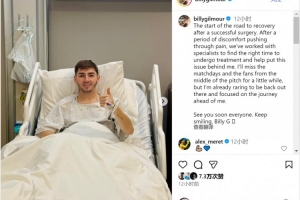 “接下来的一段日子,我会想念比赛日和球迷们,但我已迫不及待重返赛场,并将全力专注于眼前的康复征程。大家很快再见。保持微笑,比利(吉尔莫)!”