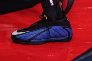 这双球鞋采用外侧蓝色、内侧红色的阴阳配色,鞋后跟处则有堪萨斯大学的吉祥物。