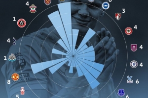 体育资讯12月3日讯 哈兰德达成英超百球里程碑,英超官方也晒出哈兰德百球攻破球门对手分布,具体如下: