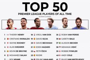 你认可吗外媒评英超历史50大球星:亨利第1 C罗第2 萨拉赫第6