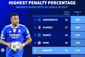 体育资讯12月4日讯 《转会市场》统计了2025年五大联赛各项赛事进球超过20球的球员的点球占比情况,格林伍德独自领跑。