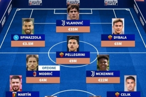 前锋:斯皮纳佐拉(那不勒斯,3500万欧元)、弗拉霍维奇(尤文图斯,3500万欧元)、迪巴拉(500万欧元)