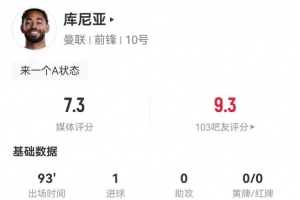 体育资讯1月4日讯 曼联在本轮英超对阵利兹联,库尼亚本场数据如下: