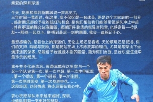 张煜东致深圳球迷的一封信:今天,我要和深圳新鹏城说一声再见了