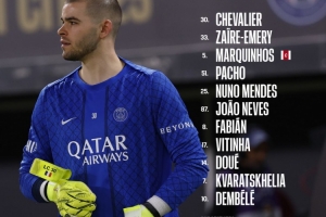 30-舍瓦利耶、33-扎伊尔·埃梅里、5-马尔基尼奥斯、51-帕乔、25-努诺·门德斯、87-若昂·内维斯、8-法比安·鲁伊斯、17-维蒂尼亚、14-杜埃、7-克瓦拉茨赫利亚、10-登贝莱