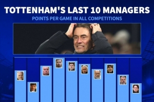 博阿斯场均拿到1.91分近10任热刺主帅最多,波切蒂诺1.84分、穆里尼奥1.77分、孔蒂1.78分、澳波1.52分。