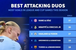 本赛季双人组进球榜:凯恩+迪亚斯37球居首,姆巴佩+维尼修斯次席