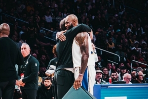 詹姆斯转发了一张赛场照,展示了他在昨日击败猛龙比赛最后时刻下场休息时,一手队友里夫斯拥抱,一手拿着自己的坐垫。