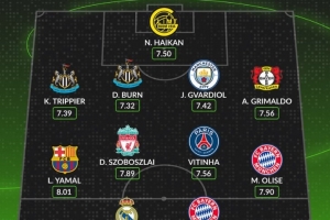 中场:亚马尔(巴萨)、索博斯洛伊(利物浦)、维蒂尼亚(巴黎)、奥利塞(拜仁)