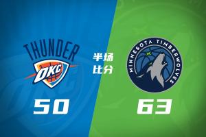 体育资讯1月30日讯 NBA常规赛,森林狼半场63-50领先雷霆。