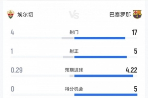 体育资讯2月1日讯 本轮西甲,巴萨半场2-1领先埃尔切。双方半场重点数据对比如下↓(主队埃尔切在前)