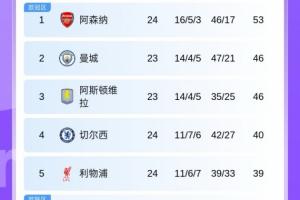 积分榜上,阿森纳先赛7分领跑,切尔西联赛三连胜后暂升第4,利物浦终结5轮不胜暂升第5。