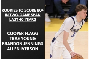 过去40年,只有四位新秀连续两场比赛合砍80+,分别是弗拉格、特雷·杨、詹宁斯和艾弗森。