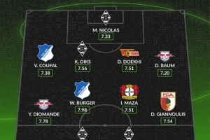 中场:扬·迪奥曼德(莱比锡,7.78分)、沃特·伯格(霍芬海姆,7.98分)、易卜拉欣·马扎(勒沃库森,7.51分)、迪米特里斯·吉安努利斯(奥格斯堡,7.54分)