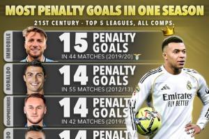 体育资讯02月03日讯 Score90统计了21世纪五大联赛球员单赛季最多点球进球榜,姆巴佩本赛季至今目前以12粒点球位居第七位。