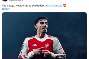 哈弗茨进球后手指队徽庆祝,阿森纳球迷摩根社媒晒出哈弗茨庆祝进球的照片,配文:“队徽,他指着队徽。”