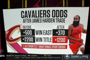 目前,骑士的冠军赔率是1:1200,和尼克斯并列第三。
