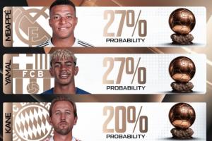 体育资讯02月04日讯 相关机构近期更新了2026年金球奖的获奖概率预测,目前姆巴佩与亚马尔并列领跑,两人获奖概率均为27%,凯恩和哈兰德则紧随其后。