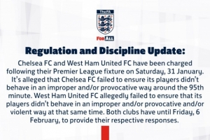 切尔西俱乐部未能确保其球员在第95分钟左右不出现不当及/或挑衅性行为。而西汉姆联俱乐部据称也未能确保其球员在同一时间不出现不当、挑衅及/或暴力行为。两家俱乐部须在2月6日周五之前分别作出回应。