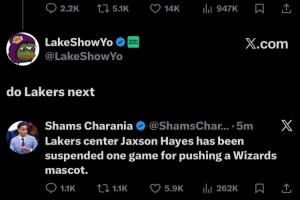 Shams也是有求必应,在五分钟后报道了湖人中锋海斯被禁赛一场的消息😅。