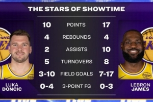 赛后,转播方晒出詹姆斯和东契奇本场的数据,东契奇伤退只打了16分钟10投3中,三分4中0仅得10分,出现5次失误;詹姆斯得到17分10助攻,但投篮17中7,三分3中0,还出现8次失误。