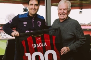体育资讯2月7日讯 伯恩茅斯俱乐部官推晒图,主教练伊劳拉收到执教球队英超百场纪念球衣。