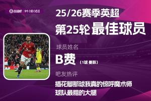 2025-2026赛季英超火热进行中,体育资讯和咪咕体育联合发起每轮英超最佳球员评选活动!第25轮评选结果已经出炉,曼联中场B费当选!曼联球员连续5轮斩获此奖项,此前4轮分别是舍什科、B费、库尼亚、卡塞米罗。