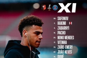 巴黎客战雷恩首发:阿什拉夫、登贝莱、杜埃出战