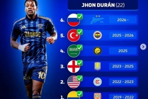杜兰(22岁):泽尼特(俄罗斯)、费内巴切(土耳其)、利雅得胜利(沙特)、阿斯顿维拉(英格兰)、芝加哥火焰(美国)、恩维加多(哥伦比亚)