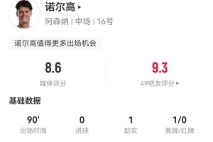 体育资讯2月16日讯 阿森纳在本轮足总杯4-0大胜维冈竞技,诺尔高本场数据如下: