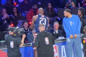 NBA记者Grant Mona晒出一段全明星现场花絮,美国星条队球星詹姆斯在赛前完成个人经典的抛撒镁粉仪式,因伤缺阵的队友库里在一旁探头探脑近距离观察,还一度想要进行模仿。随后,詹姆斯与库里击掌致意。