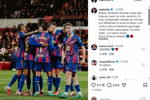 体育资讯2月17日讯 西甲第24轮比赛,巴萨客场1-2不敌赫罗纳,巴萨边锋拉菲尼亚更新社媒动态,表达对判罚的不满。