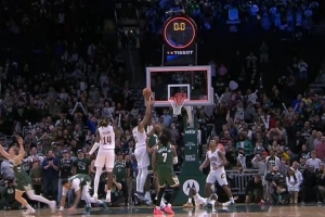解说:阿伦抓到篮板时只剩0.2秒 就差一点点 但他已足够出色
