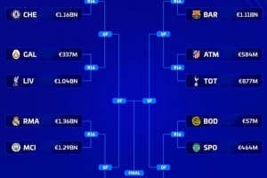 体育资讯2月27日讯 欧冠十六强战抽签已经出炉,《转会市场》也列出了各队身价情况,上半区明显高出一筹。
