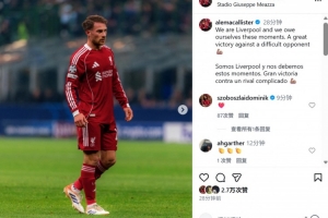 本场比赛麦卡利斯特表现不俗,他也在个人社媒晒出本场照片,配文写道:“我们是利物浦,我们值得这样的时刻。对阵强敌取得了一场很棒的胜利!”